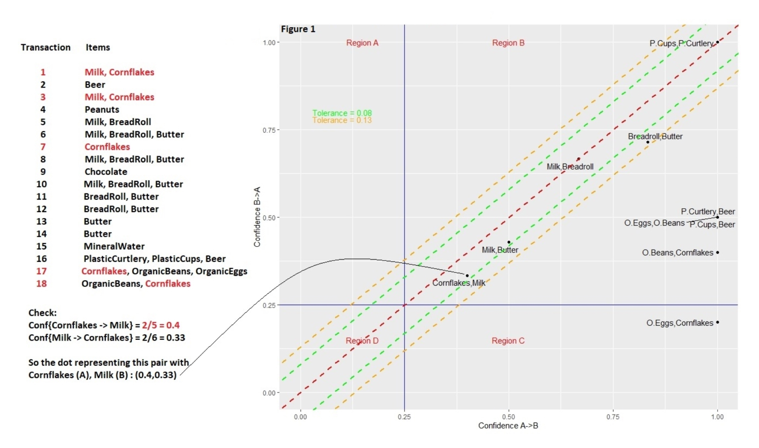 Figure 1: Basket complementarity under varying tolerance. The horizontal axis reports the probability that someone will buy item B under the assumption that A is already in their shopping trolley (i.e., conf({A} → {B})). The vertical axis reports the opposite: the chance that someone will go for A given that B is already in the cart (i.e., conf({B} → {A})). For any pair of items, these two probabilities can be found and, when plotted in 2D, a pair of items generates a single point. The more similar the two probabilities are for each pair, the closer the point comes to the line of equality (the red dashed line that runs diagonally through the origin), and the more complementary the items become. It’s rare that a dot will land exactly on the line of equality, so the green and orange lines parallel to the red line mark how far off a dot is from this ideal setting, using different levels of tolerance. From this we may say, for example, that cornflakes and milk are more complementary to each other than bread rolls and butter, as the first pairing lies closer to the line of equality.