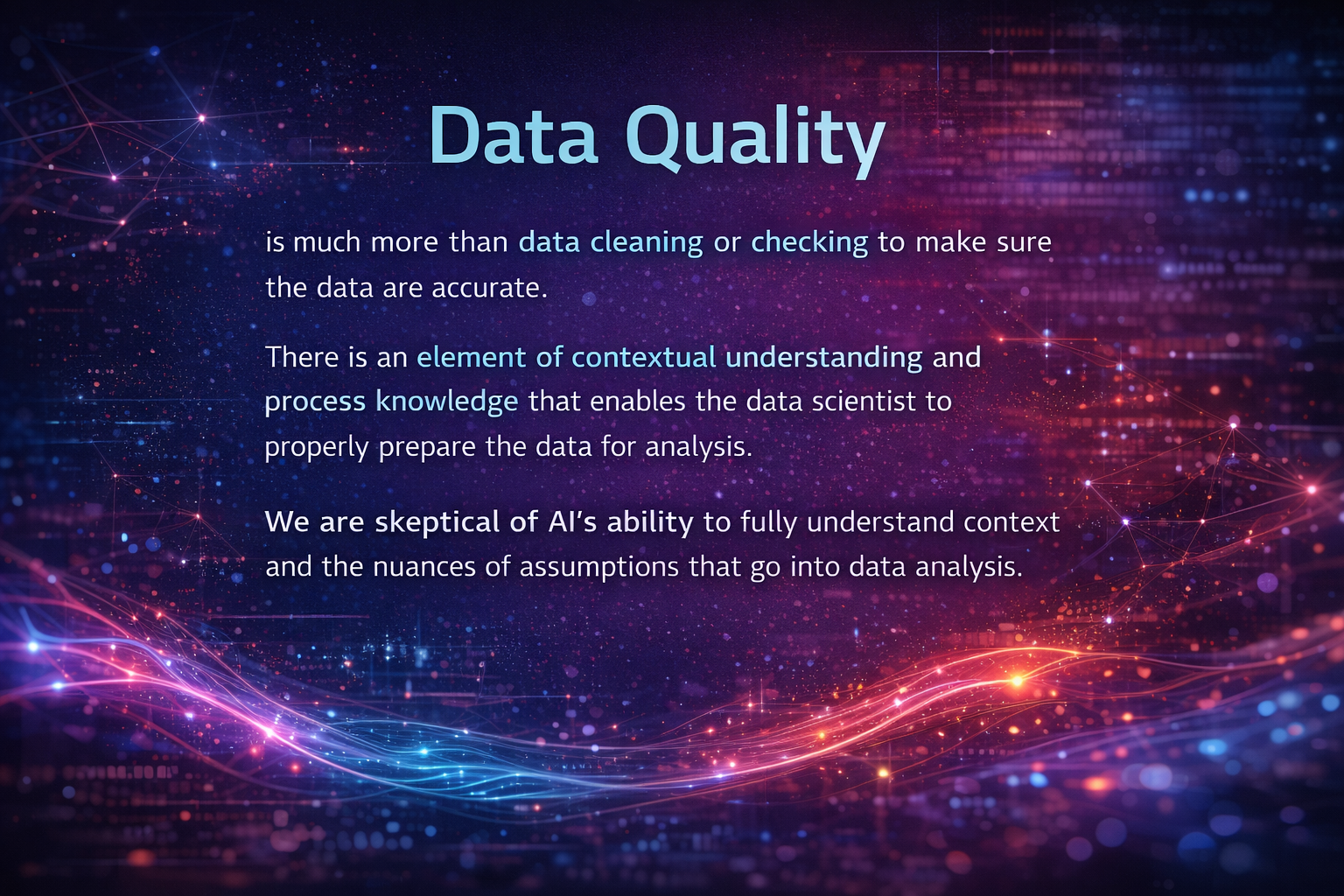 However, data quality is much more than data cleaning or checking to make sure the data are accurate. There is an element of contextual understanding and process knowledge that enables the data scientist to properly prepare the data for analysis. We are skeptical of AI’s ability to fully understand context and the nuances of assumptions that go into data analysis. In an earlier piece, Jensen provided some examples of the limitations of AI when it comes to proper data cleaning (7). For any set of data, subject matter knowledge of how the data were collected and what they represent is crucial to a proper analysis.